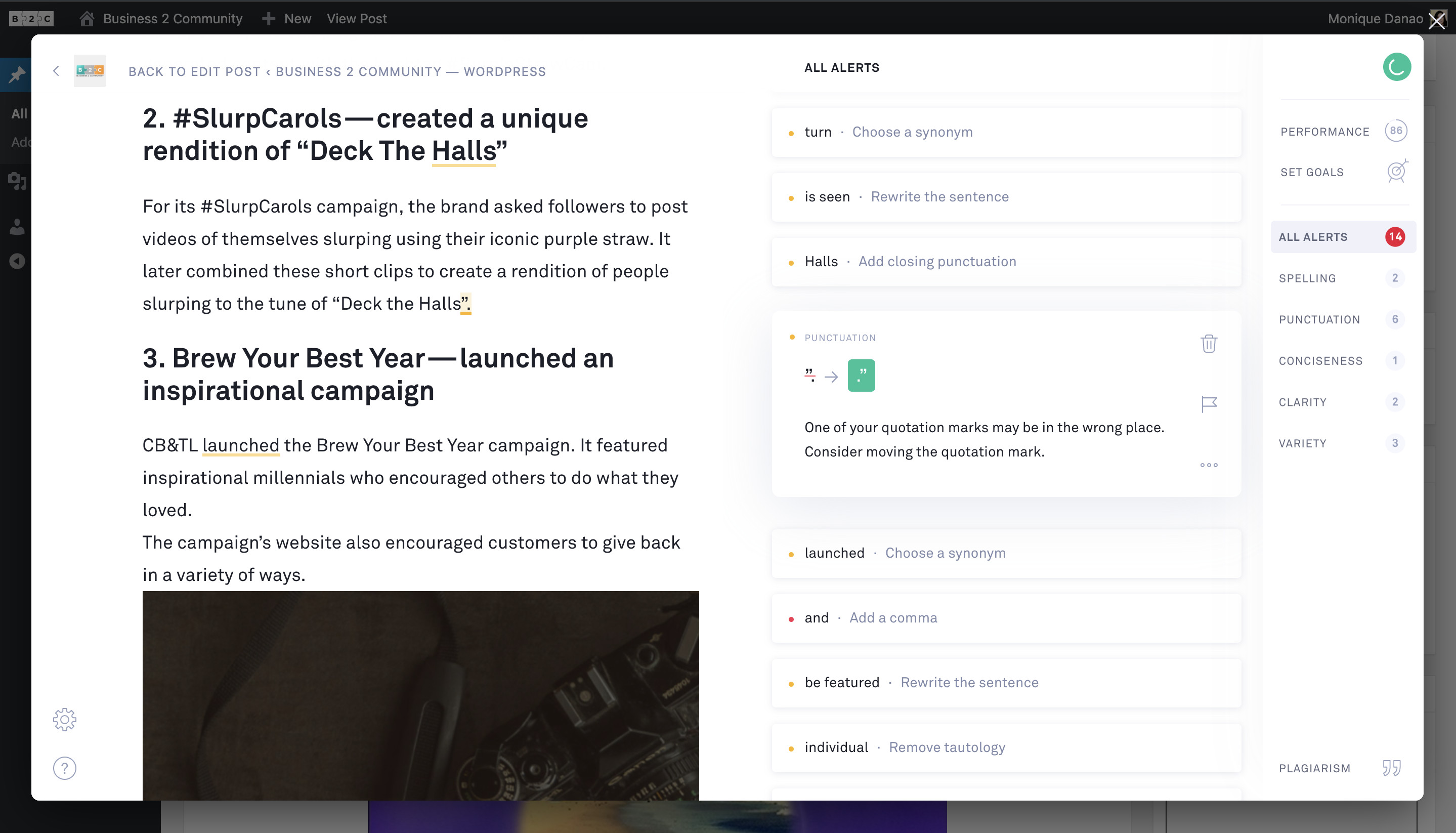 Grammarly makes suggestions based on variety, clarity, conciseness, consistency and so much more. Most online editing tools don’t go so far as to explain the rationale behind the mistake, so that’s a Grammarly feature I really appreciate. If you’re an aspiring grammar aficionado, this tool will help you learn!